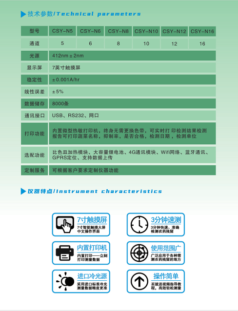 深芬儀器生產(chǎn)的新一代智能型農(nóng)藥殘留快速檢測(cè)儀是根據(jù)農(nóng)業(yè)標(biāo)準(zhǔn)方法(NY/T 448-2001)和國標(biāo)(GB/T5009.199-2003)中的酶抑制率法,嚴(yán)格遵循《GB/T5009.199-2003蔬菜中有機(jī)磷和氨基甲酸酯類農(nóng)藥殘留快速檢測(cè)方法標(biāo)準(zhǔn)》中的規(guī)定對(duì)蔬菜、啤酒等各種食品及原料中有機(jī)磷和氨基甲酸酯類農(nóng)藥殘留的快速檢測(cè)。